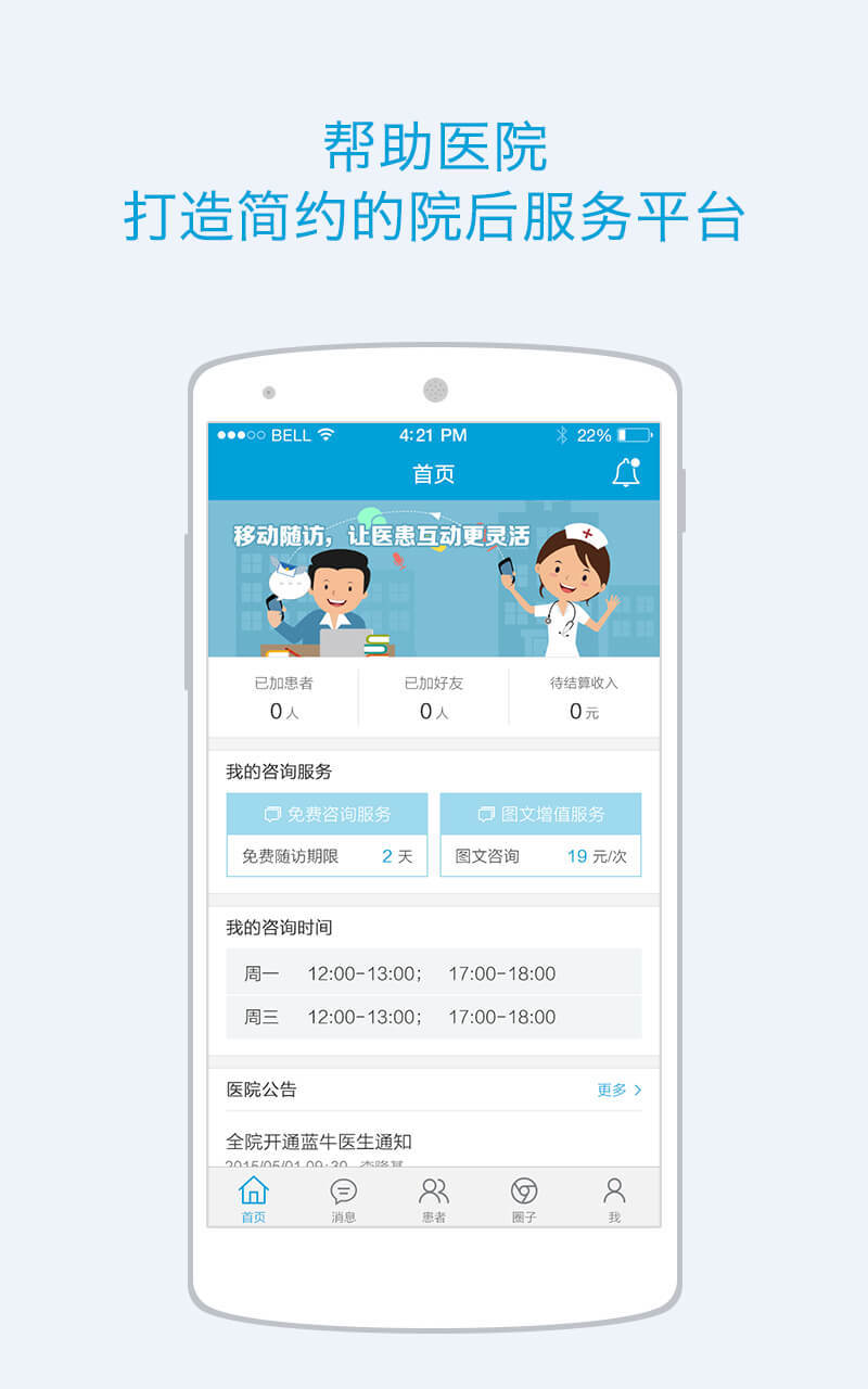 -----咨詢服務:提供對熟人患者的咨詢服務、圖文增值服務,可根據醫(yī)護自己的空余時間設置咨詢時間,可主動添加患者、好友,以實現咨詢服務的擴展。-----消息互動:以文字、圖片、視頻、短語、患者轉介、患者病歷、隨訪異常處理提醒等多種方式,便捷的實現與患者之間的消息互動、與同行之間的病例討論,從而實現院后患者服務的連貫性和可信性。