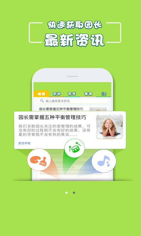 園長(zhǎng)頭條app,提供包括管理、安全、教學(xué)、育兒、活動(dòng)、評(píng)估等資訊。以一站式服務(wù),每日精心為你推薦所感興趣的資訊。并且可以快速創(chuàng)建圖文,記錄您的心得、經(jīng)驗(yàn)、園所活動(dòng),以及幼兒園招生簡(jiǎn)章,還可以一健分享至微信好友、朋友圈,與同行、好友、老師、家長(zhǎng)分享你對(duì)幼兒園滿滿的愛。【更新日志】