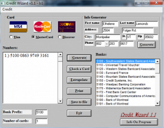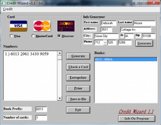 visa卡號生成器是一款功能強大的美國信用卡生成器,visa卡號生成器能夠隨機生成visa、mastercard以及discover信用卡卡號,用戶可以利用這些卡號注冊美國apple id以及注冊一些需要提供信用卡信息的網(wǎng)站,非常方便。
