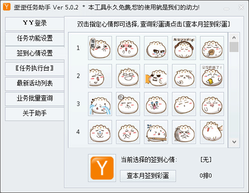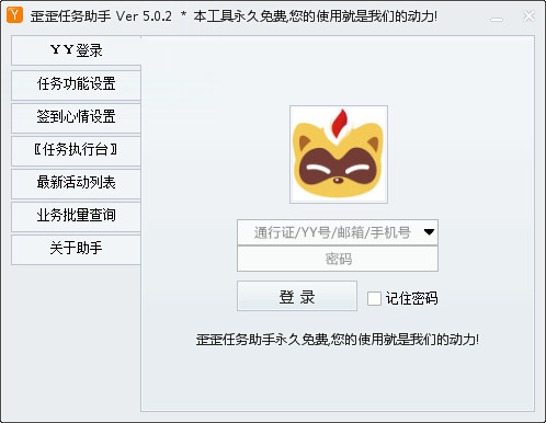 歪歪任務(wù)助手是可以幫助完成YY任務(wù)的輔助工具,YY任務(wù)都有什么,通過(guò)YY任務(wù)助手你就知道了,軟件可以全自動(dòng)YY簽到做任務(wù)、最新活動(dòng)列表等功能,完全免費(fèi),有需要的趕快下載吧!【軟件特點(diǎn)】