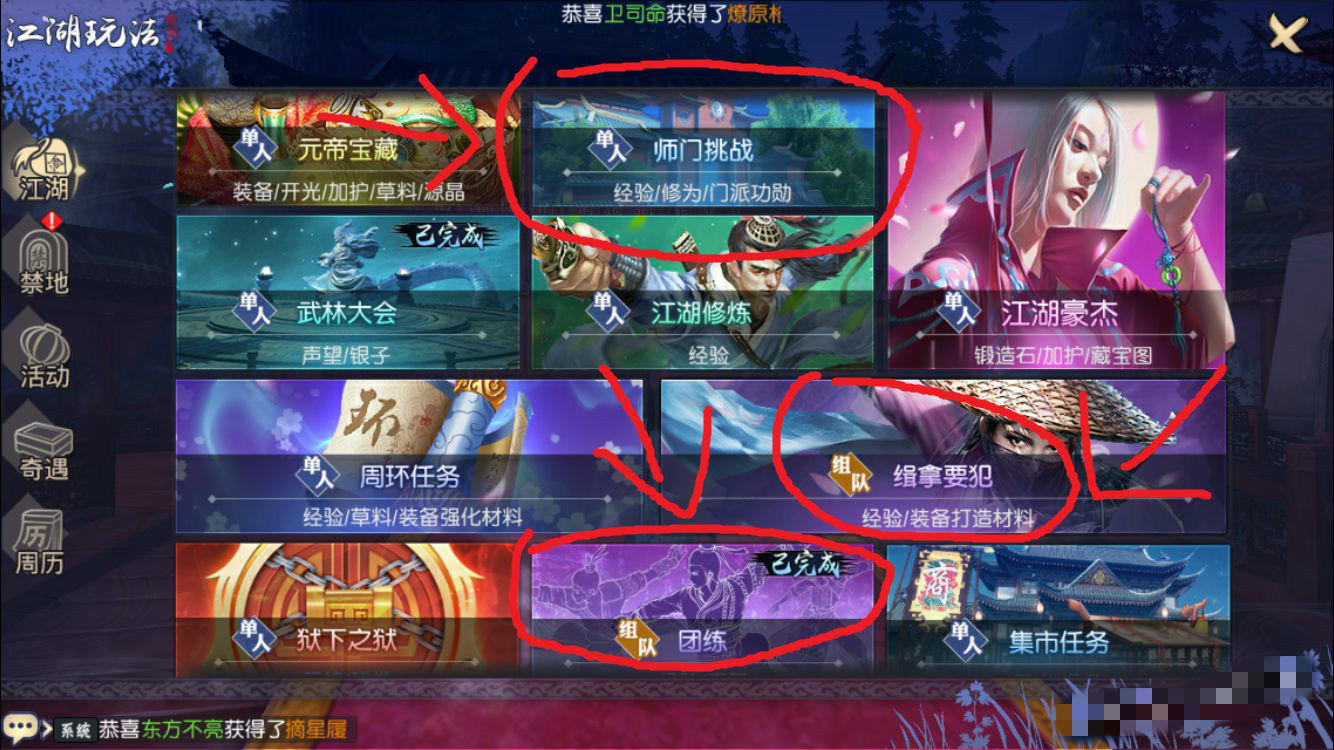 如果完全不花錢,也是可以玩的,大多數(shù)萌新進(jìn)了游戲就不停的做任務(wù),等任務(wù)做完了不知道自己該做什么了。如果你每天只有1~3個(gè)小時(shí)來(lái)玩游戲的話,團(tuán)練,天隱谷,師門任務(wù)如果有時(shí)間還有緝拿這幾個(gè)是必須做的,基本大部分經(jīng)驗(yàn)都靠他們來(lái)了
