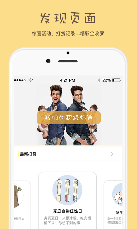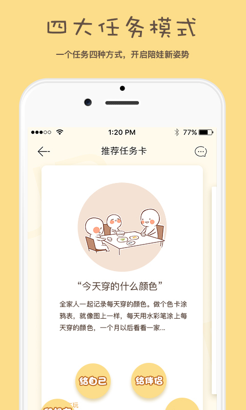 1.多種親子任務(wù)卡。幫助寶寶習(xí)慣養(yǎng)成、培養(yǎng)寶寶的各項(xiàng)能力!一鍵領(lǐng)取,家長變身大兒童陪孩子一起成長!2.獨(dú)特的任務(wù)模式。指派任務(wù)給爸爸,讓爸爸也來分擔(dān)帶娃重任;還能和好友一起做任務(wù),每個爸媽都能變身育兒達(dá)人!塞個紅包更勝過千言萬語!