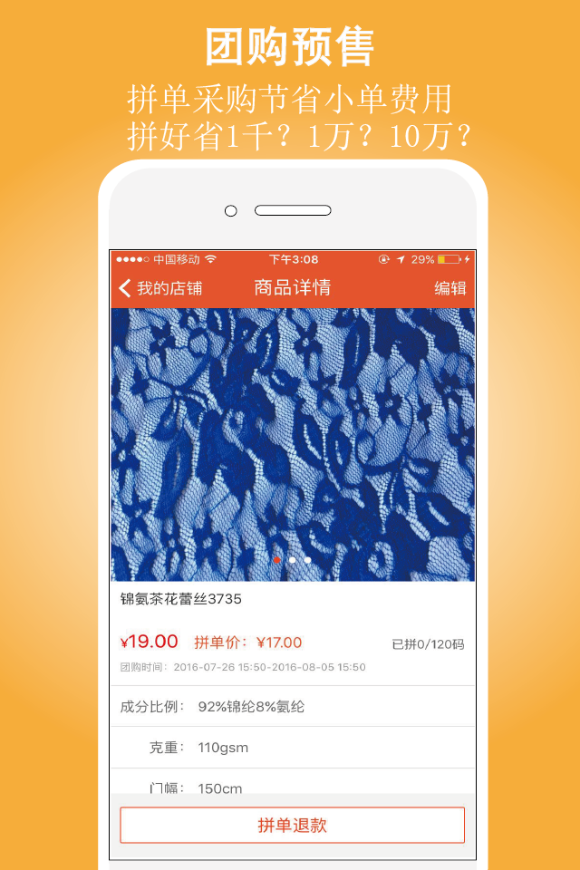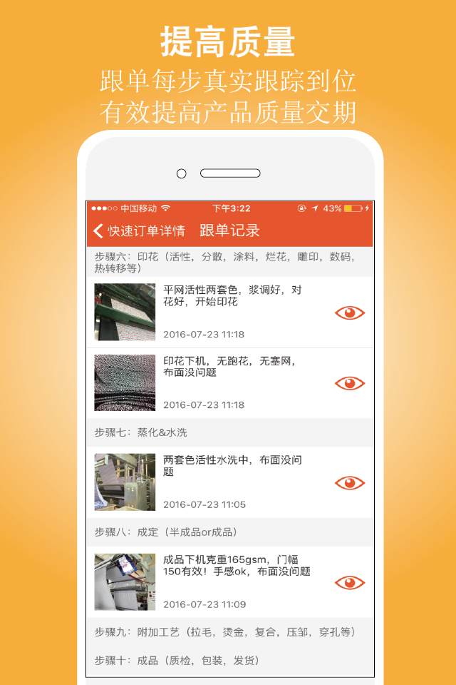 1、跟單管理幫助用戶隨時(shí)隨地精準(zhǔn)掌握跟單跟蹤面料的真實(shí)進(jìn)度,有效提高產(chǎn)品質(zhì)量和保障交期!2、拼單預(yù)售幫助用戶節(jié)省開支,降低成本,拼單后節(jié)省各類小單費(fèi),包缸費(fèi),上機(jī)費(fèi)!同時(shí)帶動(dòng)銷售!