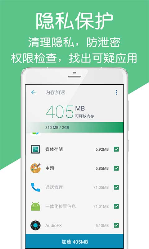 手機清理,給系統(tǒng)加速,告別發(fā)熱和頓卡!高效、快速、準確的清理手機垃圾,釋放超乎您想象的存儲空間;內(nèi)存加速,提升手機運行速度,解決手機頓卡、緩慢,操作流暢如新。體積小巧:經(jīng)過我們的特殊優(yōu)化,安裝包極小,符合情理軟件自身不占內(nèi)存、不耗電的特點;清理效果顯著專業(yè)的垃圾掃描引擎,快速準確定位并清理APP緩存和垃圾殘留,釋放超乎您想象的存儲空間。清理效果比同類軟件高于50%;手機加速,遠離頓卡、緩慢智能內(nèi)存清理,快速釋放手機內(nèi)存;全面保護用戶隱私極速分析處理用戶的通話、短信、瀏覽、搜索記錄、郵件,有效保護用戶隱私信息。