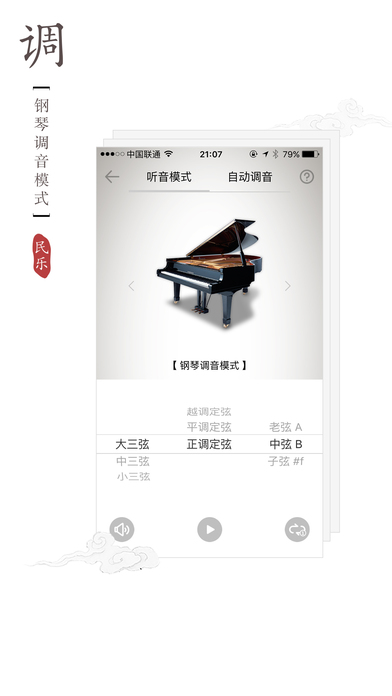1、滿足少數(shù)用戶愿意使用三角鋼琴調(diào)音的需求;2、在36簧高音笙音域之外的音,可選擇跳轉(zhuǎn)至“grandpiano調(diào)音模式”下繼續(xù)使用鋼琴音源進行調(diào)音,如大阮4弦D(73.4hz)。