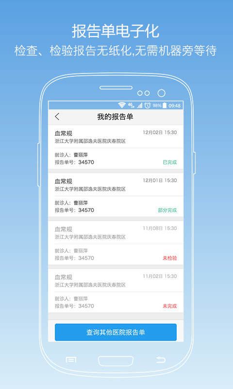 檢查、檢驗(yàn)報(bào)告單就不細(xì)說了,可以做到實(shí)時(shí),并且你到過的所有醫(yī)院內(nèi)檢查所有報(bào)告單都有顯示,按“醫(yī)院”“就診人”篩選,挺方便。