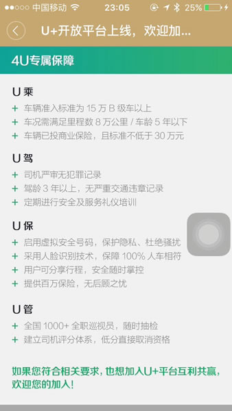 自2015年1月28日在全國(guó)上線以來(lái),神州專車以高品質(zhì)服務(wù)的定位在專業(yè)領(lǐng)域獨(dú)樹(shù)一幟,這其中最重要的一點(diǎn)就是專業(yè)車輛的保障,此次神州專車開(kāi)放的U+開(kāi)放平臺(tái)雖然對(duì)廣大私家車主伸出橄欖枝,但是入駐的第一道關(guān)口就是車輛要求:神州專車對(duì)加入平臺(tái)的車輛要求必須是15萬(wàn)元B級(jí)以上車型,車況8萬(wàn)公里里程以內(nèi)或者車齡在5年以下,且商業(yè)保險(xiǎn)不得低于30萬(wàn)元。