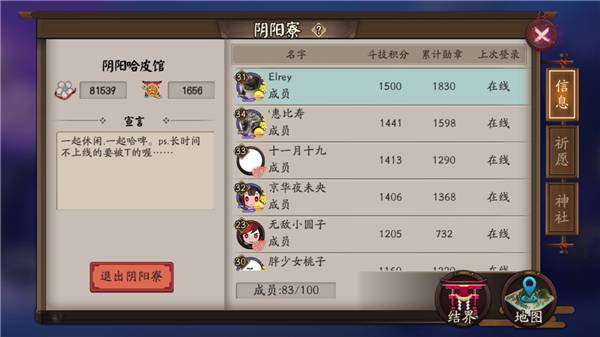 差不多這么走下去沒多久,你就可以加入陰陽(yáng)寮(工會(huì))了,盡量找個(gè)有副會(huì)長(zhǎng)的工會(huì),這樣很多工會(huì)事務(wù)會(huì)處理的很快(比如晚上開狩獵)。進(jìn)了陰陽(yáng)寮之后你就可以開結(jié)界了。