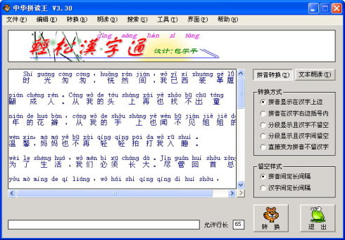 中華拼讀王是一款非常強大的漢字拼讀軟件,您可以導入本地的文本文件,也可以手動錄入,軟件會自動對您輸入的漢字標注拼音,幫助您學習漢語,軟件內(nèi)置語音引擎,可以非常準確清晰的將您輸入的內(nèi)容朗讀出來,讓您掌握正確的發(fā)音。