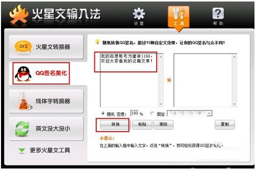 4、我們也可以用“QQ簽名美化”,然后輸入文字,點(diǎn)轉(zhuǎn)換就行了。這個比第四步的火星文轉(zhuǎn)換器好的是可以變換多種文字,你一直點(diǎn)“轉(zhuǎn)換”,轉(zhuǎn)換的文字就不一樣哦。