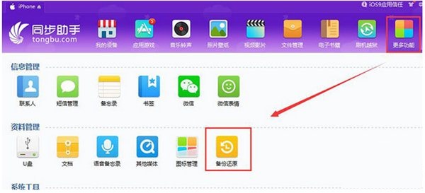2、刷機(jī)前請做好數(shù)據(jù)備份,以防刷機(jī)失敗導(dǎo)致數(shù)據(jù)丟失。運(yùn)行同步助手,進(jìn)入【更多功能】—【備份還原】可一鍵備份微信聊天記錄、應(yīng)用記錄、照片視頻等重要數(shù)據(jù)。