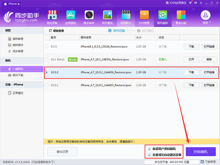4、此時可看到同步助手會自動匹配可刷機(jī)的固件版本,選擇iOS10.0.2固件,并勾選“保留用戶資料刷機(jī)”和“連接成功自動激活設(shè)備”,點(diǎn)擊【開始刷機(jī)】