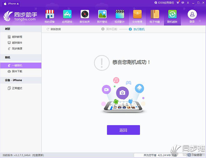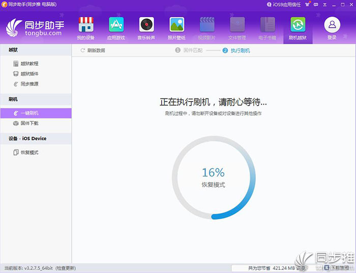 5、同步助手會自動下載固件并刷機(jī),耐心等待一會就能完成iOS10.0.2的升級操作。