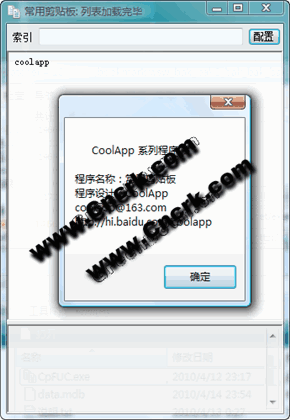 常用剪貼板程序 V1.1 簡(jiǎn)體中文綠色免費(fèi)版 常用內(nèi)容保存到數(shù)據(jù)庫(kù),通過(guò)主題或索引快速查找到內(nèi)容,雙擊標(biāo)題復(fù)制到Windows剪貼板上。 使用前需要將常用內(nèi)容錄入到數(shù)據(jù)庫(kù)。填寫適當(dāng)標(biāo)題的和索引(縮寫)。使用時(shí)瀏覽標(biāo)題列表或在索引器里輸入縮寫的字母、數(shù)字或詞匯找到合適的項(xiàng)目后雙擊就復(fù)制到了Windows剪貼板。