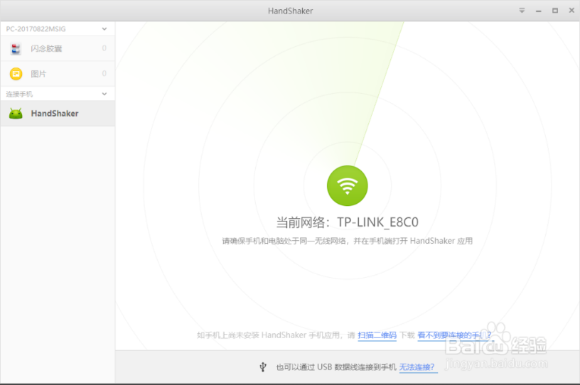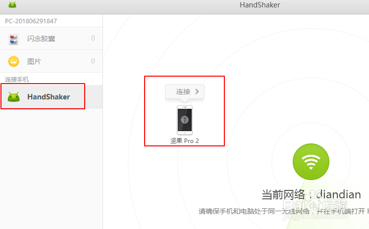 在這里小編要說兩點(diǎn),一是在同一無線網(wǎng)絡(luò)下,二是電腦和手機(jī)連接的時(shí)候,記得都要打開HandShaker軟件,如果只有手機(jī)或電腦一個(gè)設(shè)備打開是搜不到的。