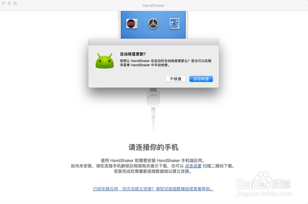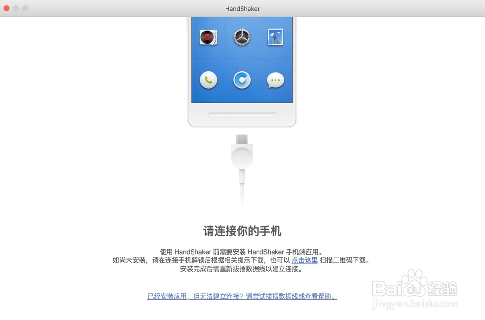 無需提前啟動(dòng)軟件,安卓手機(jī)連接數(shù)據(jù)線后,使用數(shù)據(jù)線插入mac即可快速啟動(dòng)HandShaker;