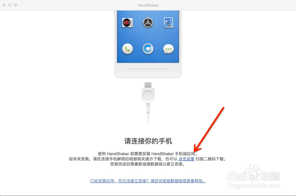 這時(shí)我們打開手機(jī)上的軟件,就會(huì)看到提示我們“打開HandShaker客戶端以建立連接”。