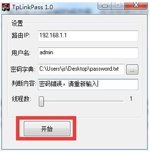 4、運(yùn)行路由器登陸密碼破解工具,在打開的程序主界面中,輸入相應(yīng)的路由器相關(guān)信息,其中在“判斷內(nèi)容”輸入框中輸入“密碼錯誤,請重新輸入”,最后點(diǎn)擊“開始”按鈕。