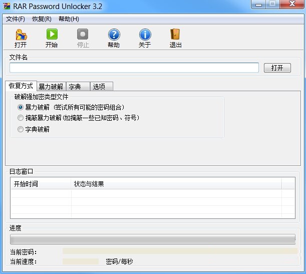 3、接下來點擊“打開”按鈕選擇要破解的WinRAR文件。然后選擇其中一種破解類型,當我們對密碼信息一無所知時,小編建議選擇“暴-力-破解”項,最后點擊“開始”按鈕正式進入破解過程。