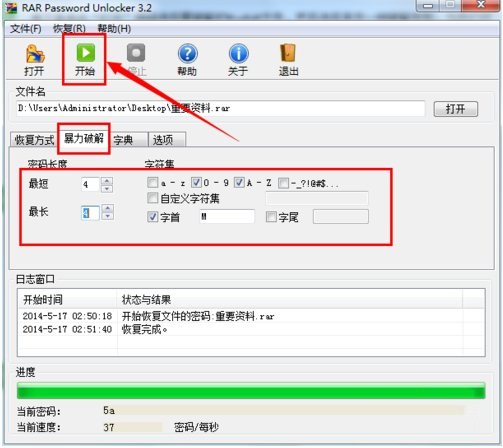 5、切換至“暴-力-破解”選項卡,然后根據(jù)自己的記憶來設置要破解的密碼組合,最后點擊“開始”按鈕。