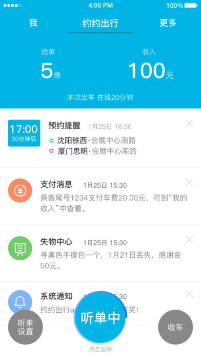約約出行司機(jī)端是一款專為廣大司機(jī)朋友們打造的專車、出租車、跨城拼車出行服務(wù)平臺(tái),司機(jī)們可以通過手機(jī)快速搶單,找到精準(zhǔn)的訂單位置,高效的解決訂單信息。