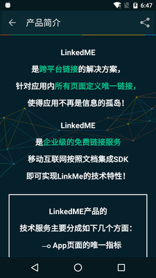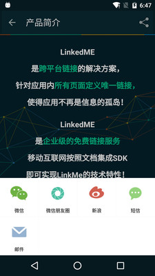 LinkedME主要研發(fā)兩款產(chǎn)品,LinkPage和LinkSense。LinkPage產(chǎn)品主要是APP自身深度鏈接功能,實現(xiàn)從任意取到(微信、微博、短信、郵件、廣告平臺、百度搜索等等)“一鍵跳轉(zhuǎn)”到APP內(nèi)的具體相應頁面,并檢測各個渠道的轉(zhuǎn)化效果,幫助移動企業(yè)運營人員優(yōu)化運營方案,提供APP的活躍度和留存率。