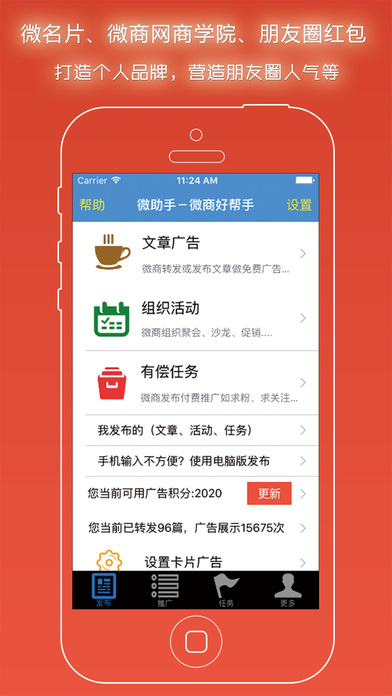 微商推廣宣傳好幫手-動(dòng)動(dòng)手指就可以創(chuàng)建微名片,加粉加人,做免費(fèi)的微商營(yíng)銷(xiāo)推廣,微商快速分享、召集好友互動(dòng)就用微助手吧,快速分享朋友圈、微博推廣廣告,更可以幫你加粉加人,沒(méi)有粉絲如何做微商?微助手助您一臂之力,幫快速做到加粉加人哦。【軟件特點(diǎn)】
