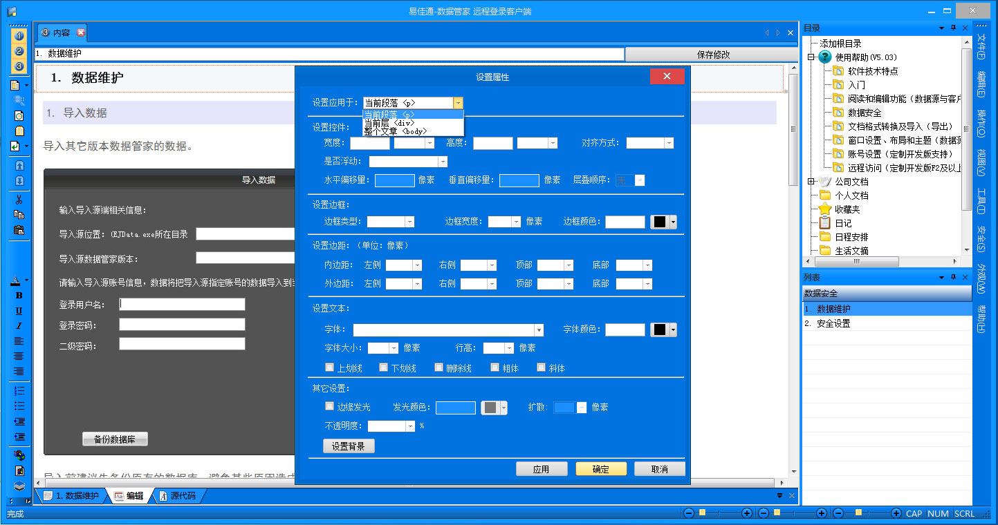 易佳通-數(shù)據(jù)管家是一款功能強(qiáng)大的遠(yuǎn)程企業(yè)文檔管理軟件,軟件方便用戶將企業(yè)信息或個人數(shù)據(jù)分類保存,打包到軟件中,防止企業(yè)或個人信息被外部竊取。軟件具有文檔格式轉(zhuǎn)換功能,用戶可以直接復(fù)制網(wǎng)頁、Word、Excel、文本等文檔到軟件的編輯器中,軟件會自動進(jìn)行格式轉(zhuǎn)換,保留原文檔的樣式。軟件具有文檔編輯器,提供豐富的編輯功能,用戶可以將文本、圖片、文件或語音保存到軟件中,保存文檔后圖片和本地文件會自動加密保存到數(shù)據(jù)庫;用戶可在文章任意位置插入文字、表格、層、圖片、文件、鏈接、語音留言等,并可對其樣式進(jìn)行設(shè)置。軟件可將用戶數(shù)據(jù)分類明細(xì)的保存,并提供了豐富的搜索查詢功能,用戶可以很容易的檢索數(shù)據(jù)信息;用戶可將軟件中的文章標(biāo)注或互相鏈接。軟件提供模板支持,用戶可將固定的文檔編輯格式保存為模板,需要時在編輯器載入即可,避免重復(fù)編輯,提高效率。軟件提供了豐富的界面布局和主題,用戶可以任意設(shè)置軟件中窗口的布局,字體的大小,并可以保存用戶自定義布局;軟件提供了多種界面主題,用戶可對軟件的顏色和外觀做出多種選擇;軟件的工具欄可以自定義,用戶可以根據(jù)使用習(xí)慣任意增加或刪除工具欄。