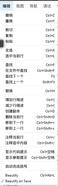 自動(dòng)給你格式化 JavaScript,HTML,CSS 等代碼。在 編輯 菜單下,多了兩個(gè)菜單項(xiàng):Beautify 還有 Beautify On Save。