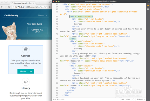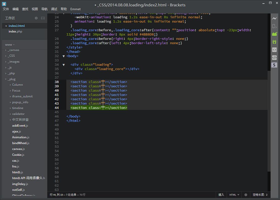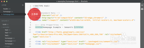 先打開Brackets編輯器,可以看到左邊是目錄,右邊是代碼區(qū)。