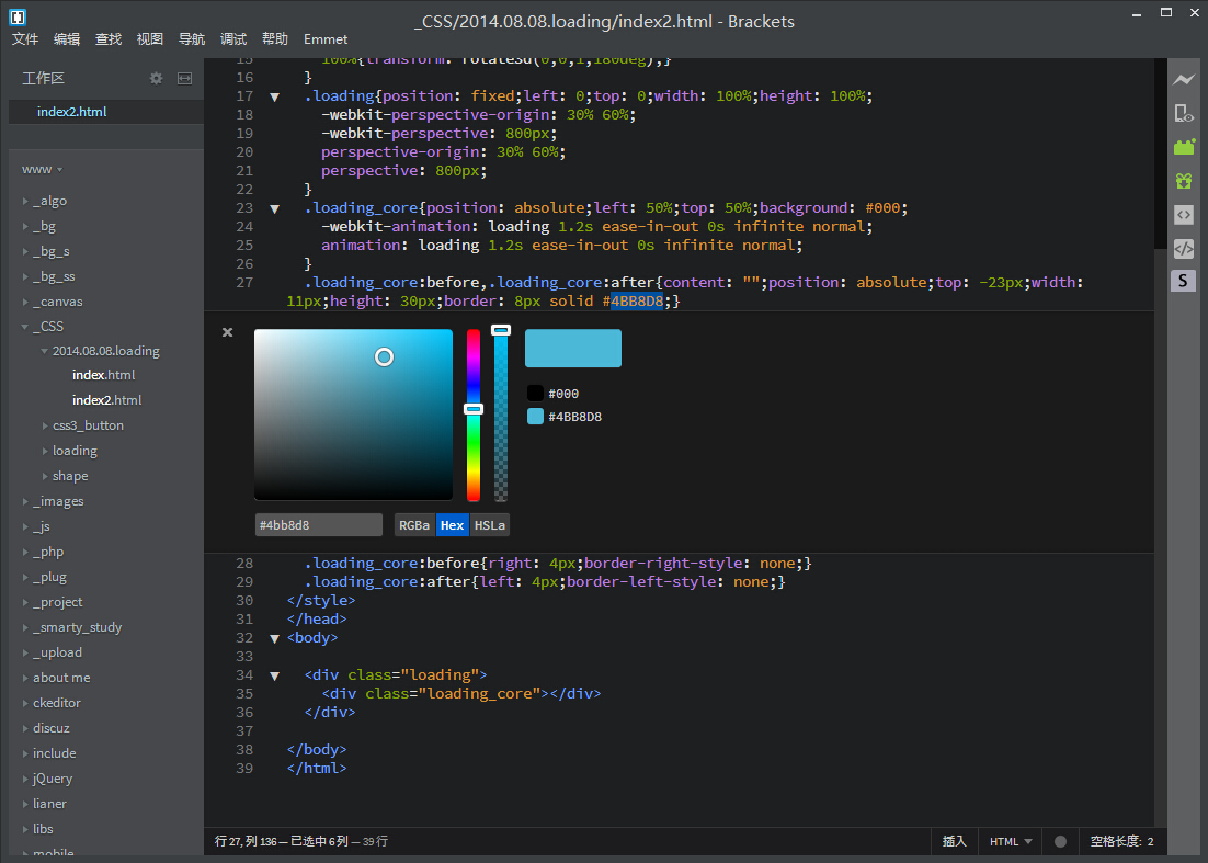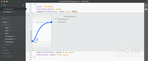 Brackets 允許我們快速去編輯 HTML 或者 CSS 文檔??焖倬庉?HTML 文檔,可以去為選中的元素快速添加或者修改樣式。編輯器會(huì)給你顯示出應(yīng)用在所選中元素上的所有的樣式,選中對(duì)應(yīng)的樣式,直接去修改,這樣你就不需要再去找到對(duì)應(yīng)的樣式表,對(duì)應(yīng)的地方去修改了??焖倬庉嬐瑯舆m用 CSS 文檔,比如放在顏色屬性上,會(huì)顯示一個(gè)顏色選擇器,或者動(dòng)畫屬性上,會(huì)顯示一個(gè)可以調(diào)整動(dòng)畫曲線的工具。非常非常方便。