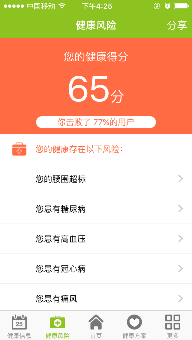 健康風險:通過對采集數(shù)據(jù)進行分析,專家會反饋用戶存在的健康風險與得分;