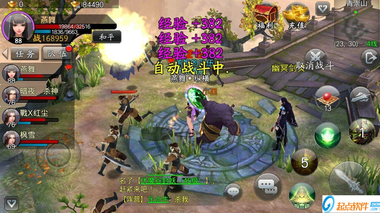 掛機野外經(jīng)驗十分豐厚,且無上限,怪物等級越高,經(jīng)驗越多,45級后青崇山是掛經(jīng)驗最佳處。人數(shù) 越多,經(jīng)驗也越多。最好組滿。掛機時,記得把掛機里面的自動吃藥取消掉,死亡后復(fù)活形式選擇復(fù)活點,不然會浪費很多九還丹。