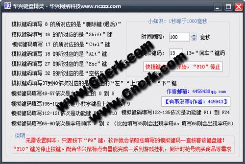 無需設置腳本,只要按下“F9”鍵,軟件就會依照您填寫的模擬鍵碼一直按著該鍵盤鍵!“F10”鍵為停止按鍵。配合華興鼠標點擊器能完成一系列游戲掛機,倒計時搶號購買商品等需求(已經(jīng)解決360誤報,請放心使用)