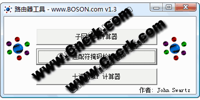 路由器工具,包含了三個(gè)實(shí)用程序: 子網(wǎng)掩碼計(jì)算器(IPSubnetter v1.2) 通配符掩碼檢驗(yàn)器 十進(jìn)制IP計(jì)算器