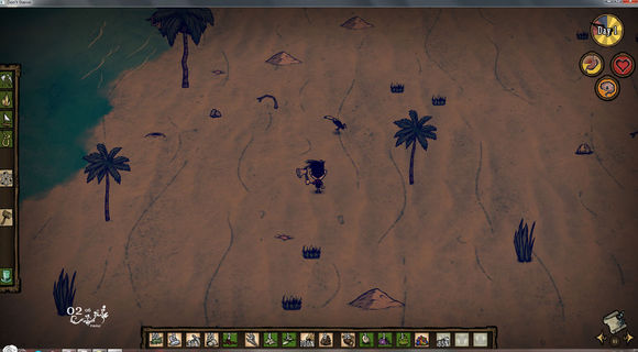 接下來的時間里就是:鏟樹苗,看地形,看島上資源,找窩家的位置。(食物問題可以不用糾結(jié),前期生吃沒關(guān)系,腦殘低了解鎖一個科技就回來了。)
