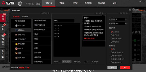 龍弋電競宏平臺是一款鼠標(biāo)鍵盤驅(qū)動軟件,兼容所有鼠標(biāo)鍵盤,外設(shè)插上電腦即可智能識別,并享有配置按鍵宏命令、熱鍵等功能。不管是游戲還是日常辦公,都將為你帶來便捷,同時增加外設(shè)可玩性。【功能介紹】