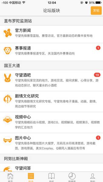 論壇板塊:官方新聞、賽事報(bào)道、守望酒吧、劇情文化研究、視頻中心、圖片中心、守望問答、英雄攻略、技戰(zhàn)術(shù)研究;