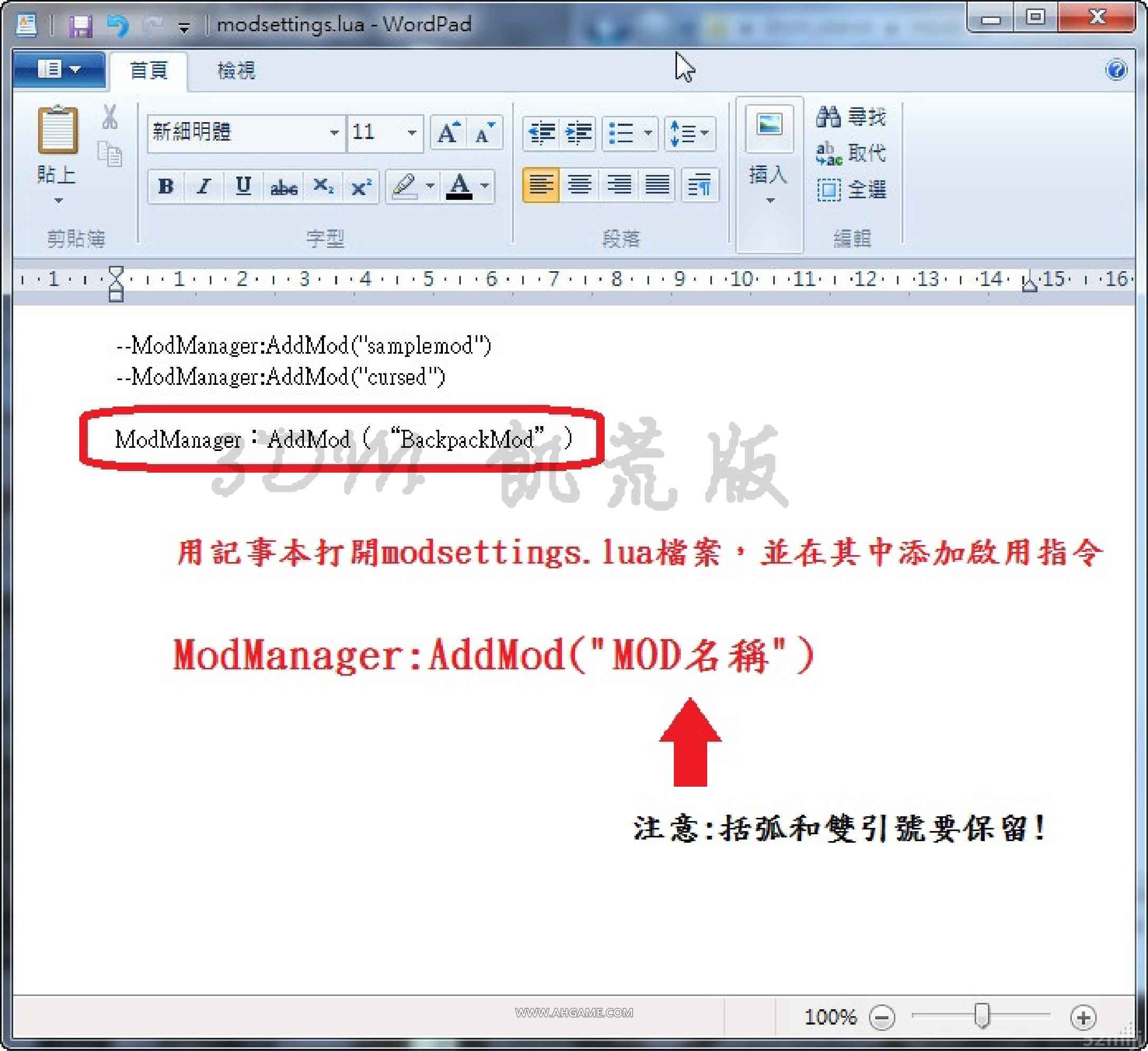 3.用記事本打開Mods資料夾中的modsettings.lua,在裡面添加啟動指令。