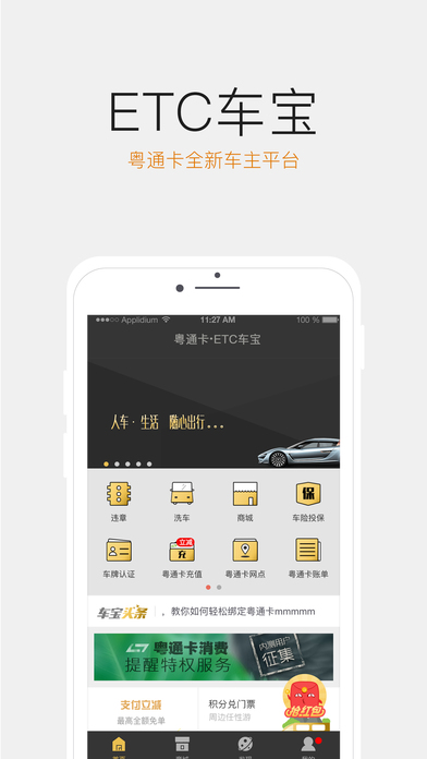 粵通卡·ETC車(chē)寶是一款提供粵通卡業(yè)務(wù)辦理、汽車(chē)生活服務(wù)的移動(dòng)APP,依托“粵通卡”品牌,致力打造中國(guó)領(lǐng)先的用車(chē)生活垂直O(jiān)2O平臺(tái),向用戶提供粵通卡充值查賬、違章查詢(xún)辦理、車(chē)險(xiǎn)比價(jià)、洗車(chē)保養(yǎng)等綜合用車(chē)服務(wù)。【軟件功能】
