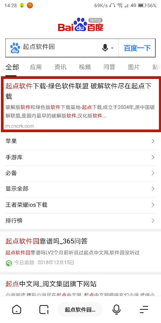 1.首先打開瀏覽器,百度搜索起點(diǎn)軟件園,選擇第一個(gè)進(jìn)入起點(diǎn)
