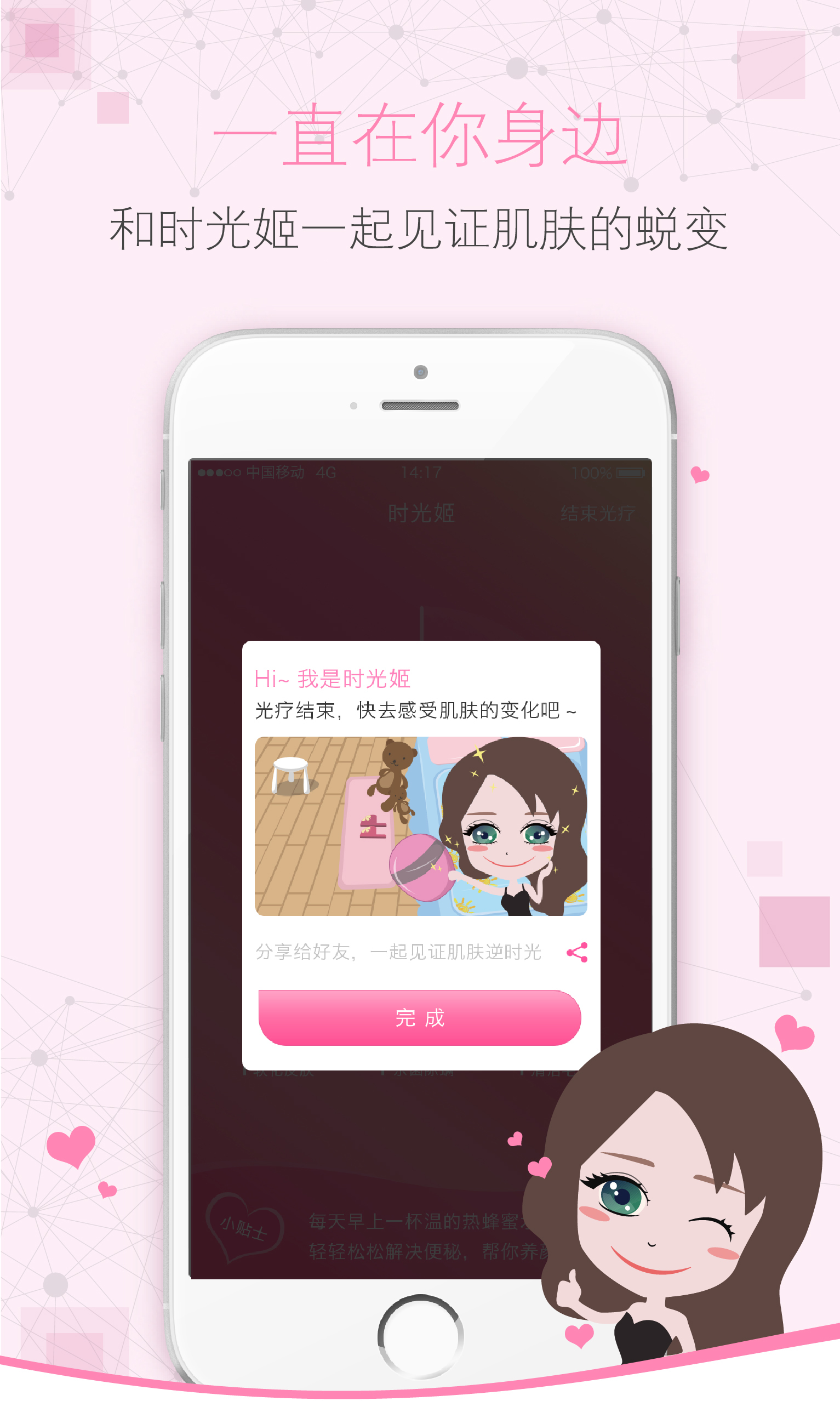 時(shí)光姬APP為時(shí)光姬居家光動(dòng)力修護(hù)嫩膚儀的配套APP。時(shí)光姬居家光動(dòng)力修護(hù)嫩膚儀是一款源自醫(yī)美級(jí)的光療儀器?;诓煌蛹?xì)胞色基對不同波長光的吸收選擇,作用于線粒體產(chǎn)生生物刺激效應(yīng),給細(xì)胞注入能量,促使生成膠原蛋白和彈力蛋白,使表皮細(xì)胞緊致排列,改善細(xì)胞微循環(huán),重筑肌膚健康屏障,讓肌膚柔軟、通透、白嫩。每天十分鐘,讓肌膚透亮有光彩。時(shí)光姬(AirMCL)主打居家“光修護(hù)”,把美容院帶回家,不想去美容院,在家就用時(shí)光姬,使用APP控制時(shí)光姬,讓美麗更簡單。