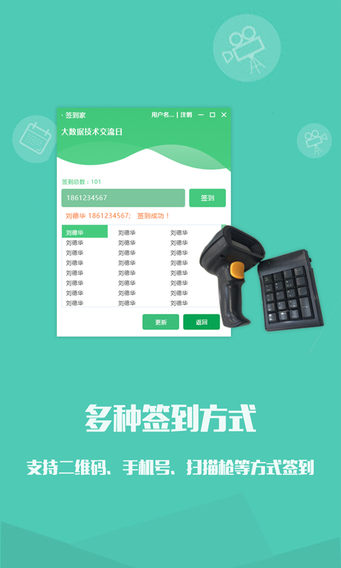 1,多樣化的簽到方式,二維碼、條形碼和手機(jī)號(hào),支持單人和批量簽到。