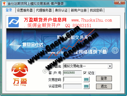 萬盈期貨模擬交易系統(tǒng)是本公司開發(fā)的一款完全免費(fèi)的期貨開戶模擬交易軟件,純綠色無插件系統(tǒng)解 壓就可以使用,無需安裝。使用本軟件可以不花一分錢就能練習(xí)炒期貨。開盤時(shí)間免費(fèi)注冊和使用,注冊模擬賬戶不需要填寫真實(shí)客戶資料,模擬賬戶的手續(xù)費(fèi)標(biāo)準(zhǔn)比真正的 標(biāo)準(zhǔn)要高很多,如果需要開設(shè)真正的賬戶請聯(lián)系我們