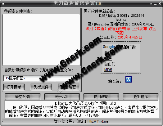 黑刀微盾解密專家 因微盾及與其類似的變形加密方式過多(如PHPlockit等),本程序僅提供常見的威盾加密方式的解密,完成后自動去除域名校驗限制等。