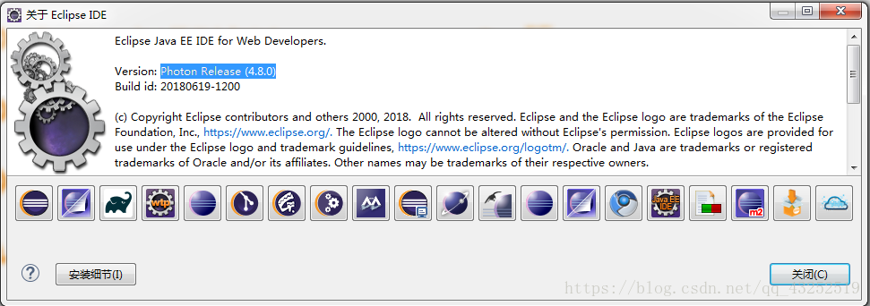方法二:在Eclipse啟動(dòng)后,點(diǎn)擊菜單欄中的Help(幫助)>>About Eclipse(關(guān)于 Eclipse IDE)會(huì)彈出的About Eclipse窗口,在這里也可以找到當(dāng)前Eclipse的版本名稱和版本號(hào)(Photon 4.8.0);