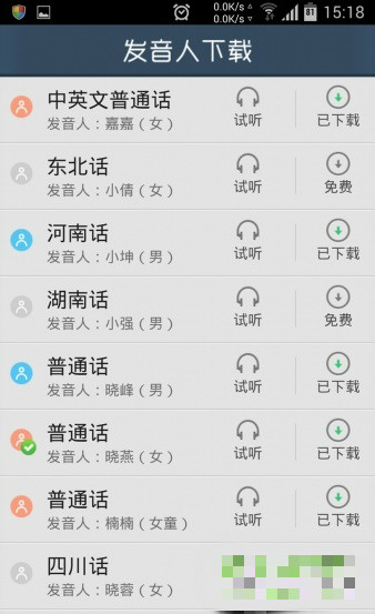 方正暢聽提供了五種播音人語音,分別是青年女聲、青年男聲、童年女聲、青年女聲(四川話)、青年女聲(英語)。