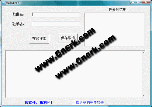 歌詞輕松下。功能:方便下載歌詞。有時(shí)為了搜索一首歌的歌詞,要操作很多步驟,有了這個(gè)小軟件,只要輸入關(guān)鍵詞,就快速搜索到歌詞,方便實(shí)用。