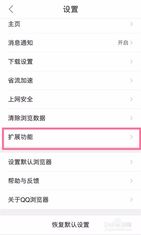 此時會彈出設置頁面,在設置頁面里我們向下滑動,找到【擴展功能】選項并點擊打開