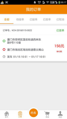 貨主可通過“約車”功能,填寫發(fā)貨地、收貨地、用車時間、貨物體積重量等信息,直接下訂單。如有司機競標成功此訂單,則交易產生,貨主需要支付司機相應的費用。